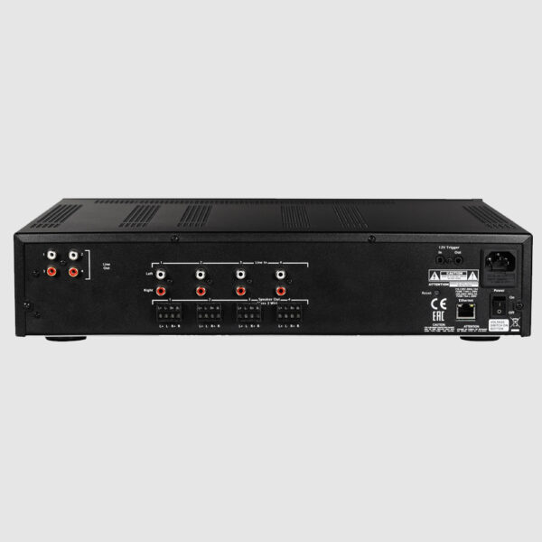 Gli amplificatori multi-canale ELAC sono dotati di uscite assegnabili (8 canali 4 uscite), che consentono progetti estremamente flessibili. Alimenta una stanza con altoparlanti da soffitto con gli amplificatori integrati e assegna una delle uscite a un subwoofer amplificato nella stessa stanza. Puoi anche applicare filtri passa-alto agli altoparlanti a soffitto/a parete.