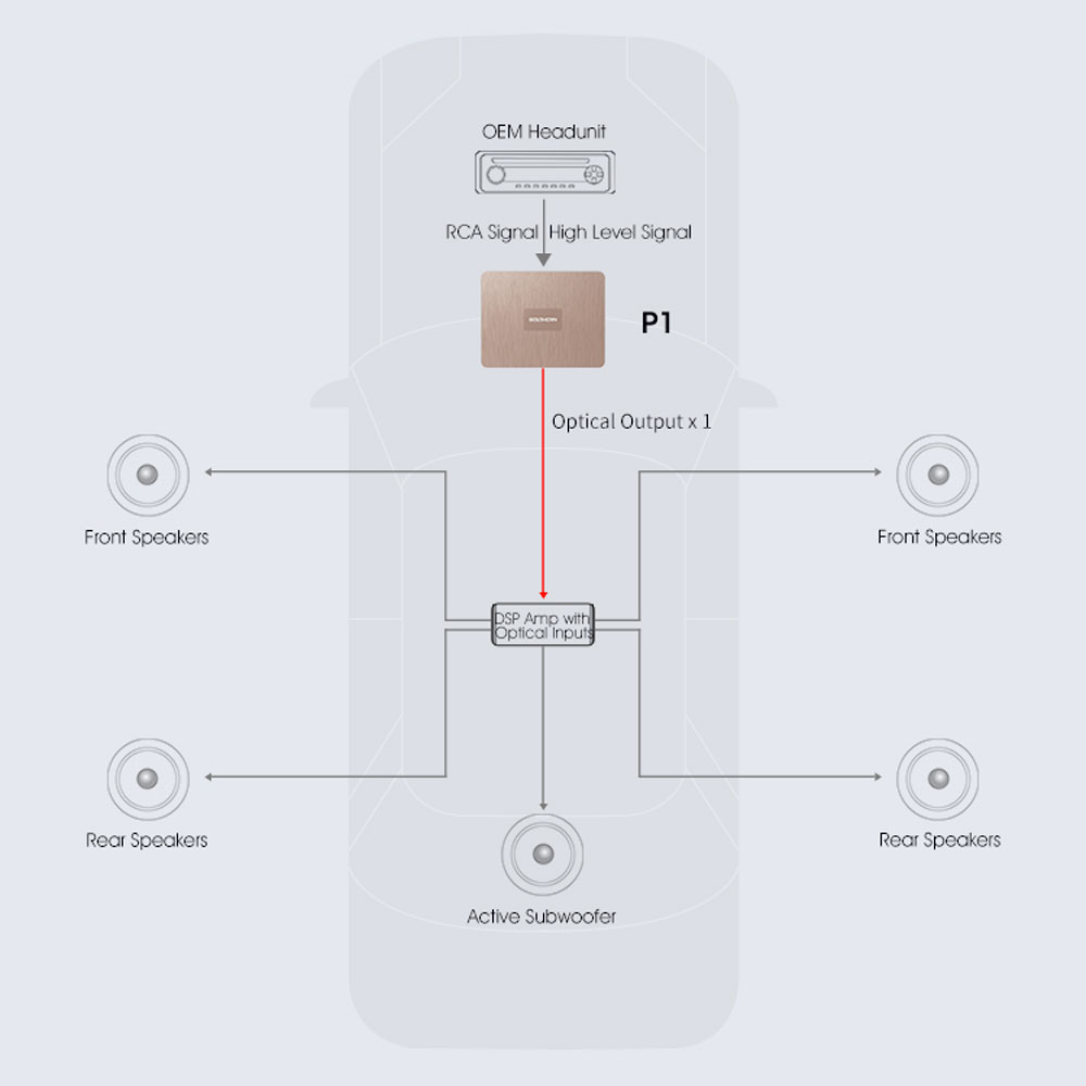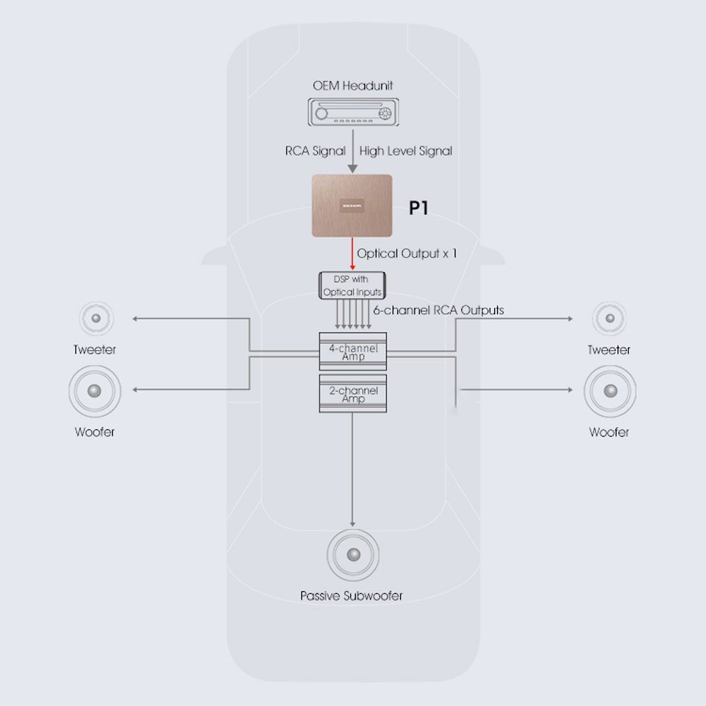 - Upgrade intelligente dell’impianto OEM: ingressi High-Level per integrare l’unità di serie senza stravolgere la plancia.