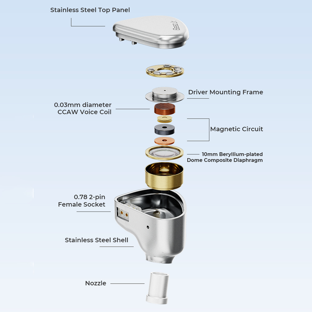 Il cuore del progetto è un driver dinamico da 10 mm con diaframma composito a cupola placcata in berillio e bobina CCAW ultrasottile da 0,03 mm. Questa combinazione assicura rapidità nei transienti, buona estensione in basso e una resa sonora equilibrata e naturale, con distorsione contenuta.