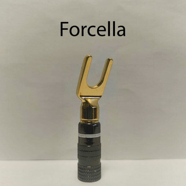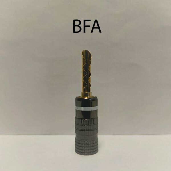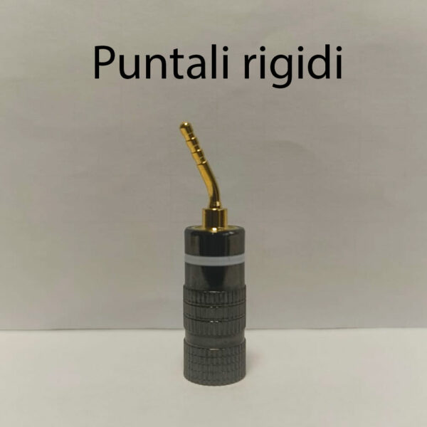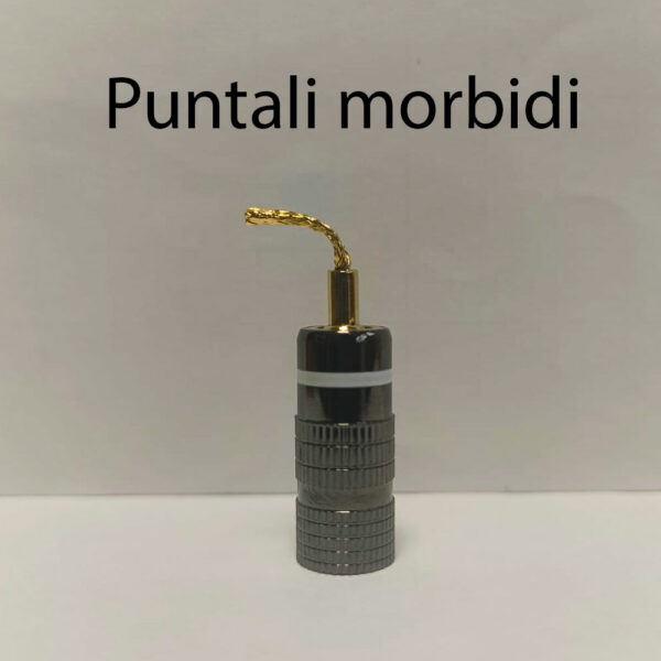 Le terminazioni sono protette con guaina termorestringente rosso e nero per evidenziare la connessione al diffusore destro e sinistro. Utilizziamo connettori a Banana della Nakamichi placcati oro 24K con protezione in alluminio.